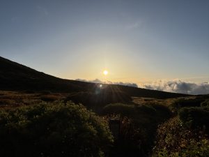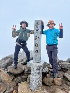 室堂到着後から天気は急変し、夜には暴風雨となり翌日の登頂、下山に不安を抱えながら就寝しました。翌日の日の出前から奇跡的に天気が回復し、ご来光を拝むことができました。あきらめかけていた登頂に挑むことができ、二人で山頂の御前峰(2702m)に立つことができました。