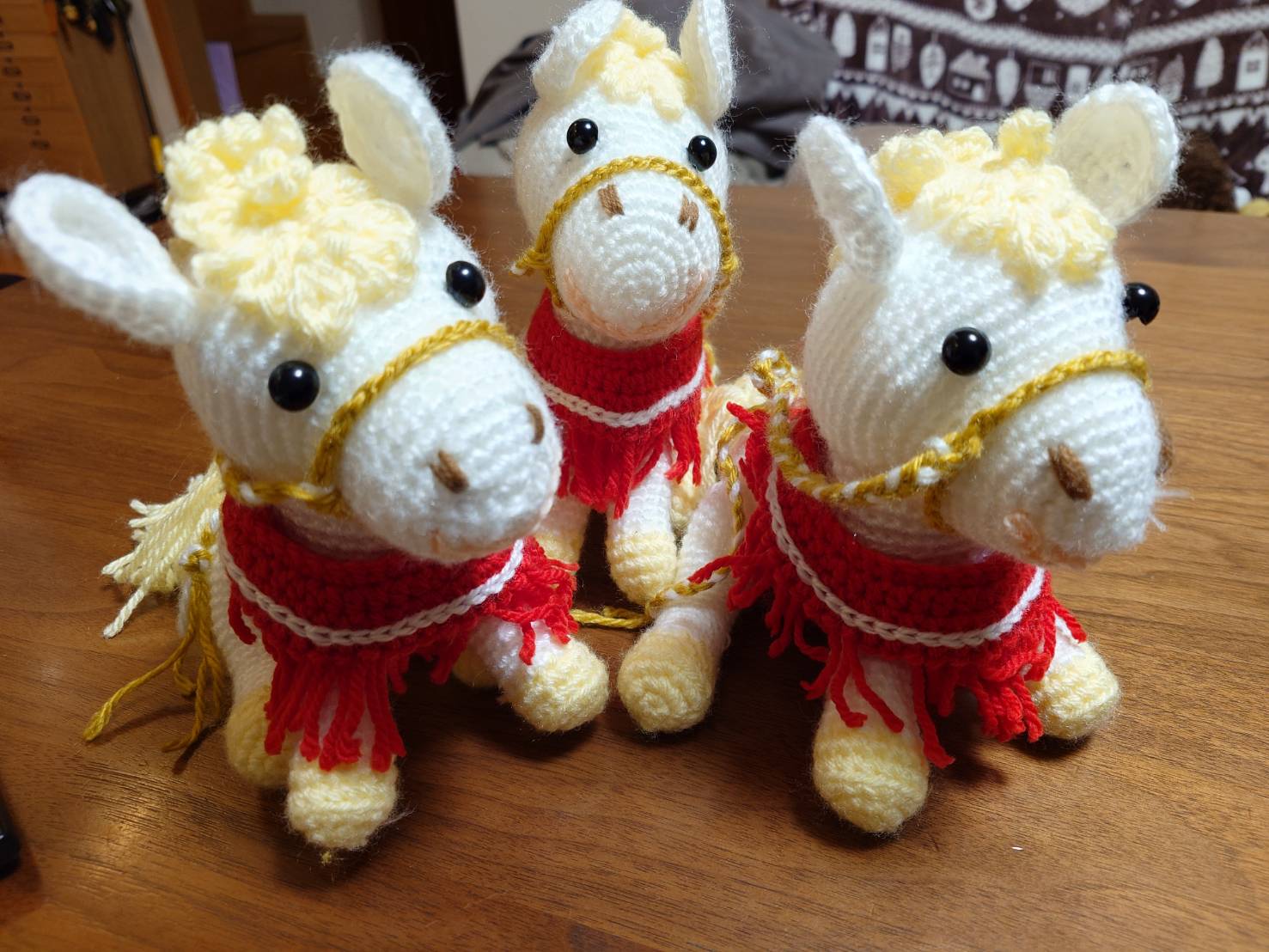 今年もヤマタイムの干支のプレゼントにご応募いただき、ありがとうございました。今年は、6名の方にご応募いただき、がんばって3体編んでお送りいたしました。抽選に外れた方3名には遅くなりましたが小さめの馬をお届けしました。本当にありがとうございました。